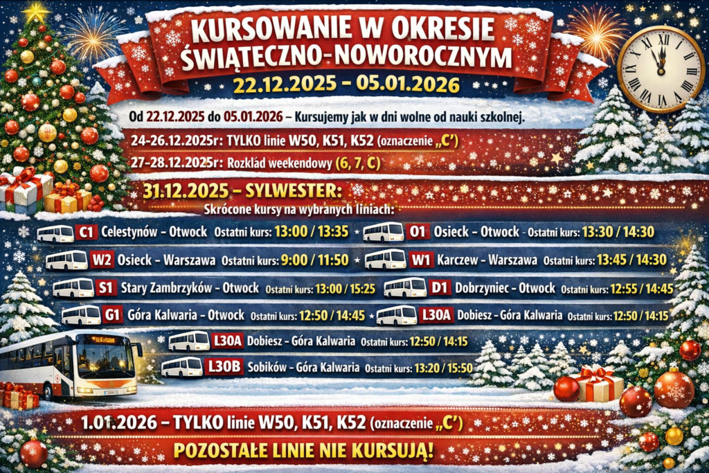Od 22.12.2025 do 05.01.2026 – Kursujemy jak w dni wolne od nauki szkolnej.